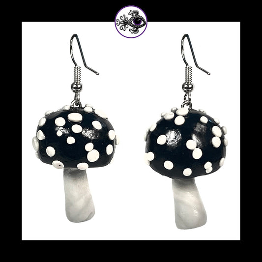 Mushrooms - Black Amanita - Handmade Clay Dangle Earrings