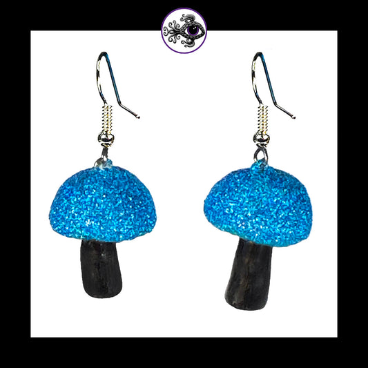 Mushrooms - Blue & Black Sparkle Amanita - Handmade Clay Dangle Earrings *Custom Order Only*