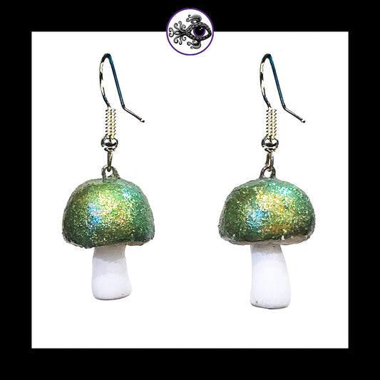 Mushrooms - Green Shimmer - Handmade Clay Dangle Earrings