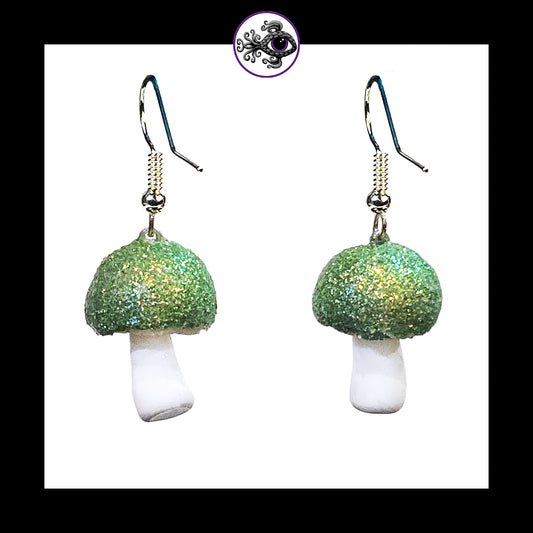Mushrooms - Green & White Sparkle - Amanita Clay Dangle Earrings