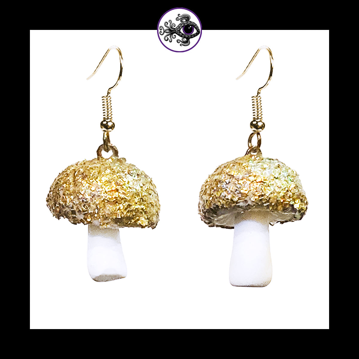 Mushrooms - Gold & White Shimmer - Handmade Clay Dangle Earrings